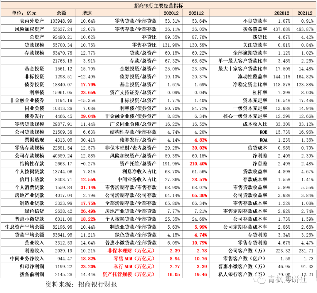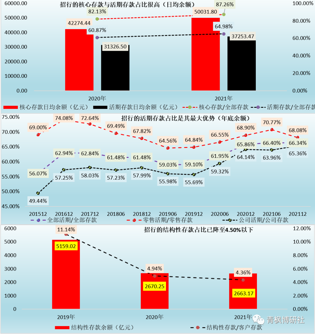 2、核心存款是招行的內(nèi)部考核指標(biāo),主要指剔除大額存單、結(jié)構(gòu)性存款等成本較高的存款。事實(shí)上持續(xù)擴(kuò)大客群規(guī)模、壓降或?qū)Ω叱杀敬婵罨蜻M(jìn)行量價管控以優(yōu)化存款結(jié)構(gòu)、應(yīng)對存款成本剛性上升壓力也是招行2020年以來的主要任務(wù)。2021年,招行的核心存款日均余額達(dá)到50031.80億元,同比大幅增長18.92%,占客戶存款日均余額的比例更是高達(dá)87.26%(較2020年大幅提升 5.13個百分點(diǎn))。這意味著,對于招行而言,高成本存款占比已不到13%。
