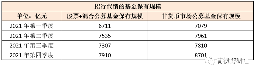 招行對代銷業(yè)務(wù)的重視還可以看另外一個數(shù)據(jù),即公募基金的銷售保有規(guī)模,中基協(xié)所公布的基金代銷機(jī)構(gòu)公募基金銷售保有規(guī)模數(shù)據(jù)顯示,招行于2021年四個季度代銷的非貨幣市場公募基金保有規(guī)模分別為7079億元、7961億元、7810億元和8701億元,其中股票+混合公募基金保有規(guī)模分別為6711億元、7535億元、7307億元和7910億元。