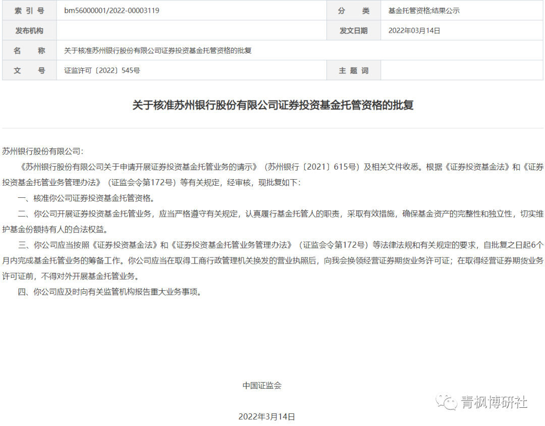 1、2022年3月14日,證監會核準了蘇州銀行的證券投資基金托管資格,這是2014年5月江蘇銀行獲批基金托管資格以來,獲得基金托管資格的首家內 資行,意味著內資行獲得基金托管牌照的大門再次打開。