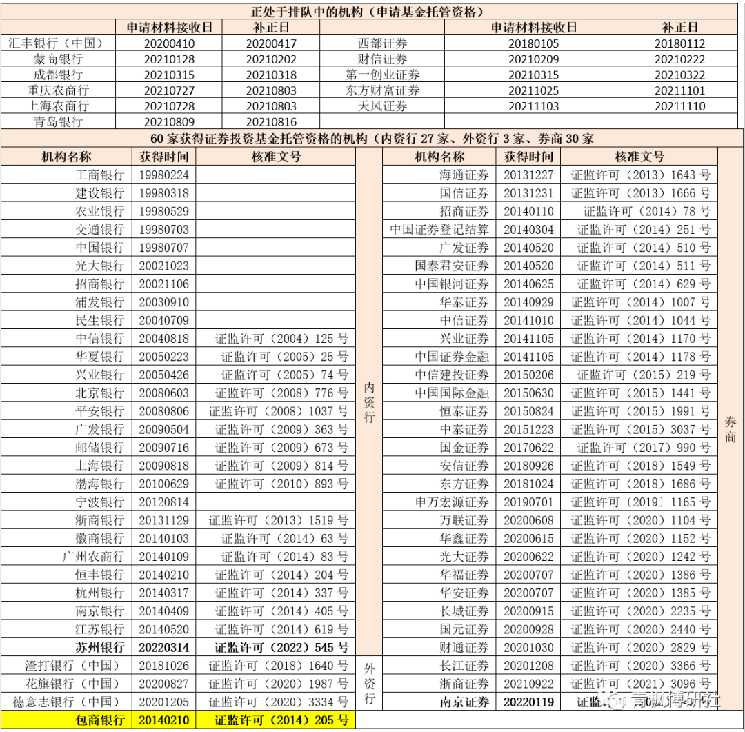 除上述60家已獲得基金托管資格的機構外,還有11家正處于申請基金托管資格的排隊序列中,具體包括5家內資行、1家外資行和5家券商。