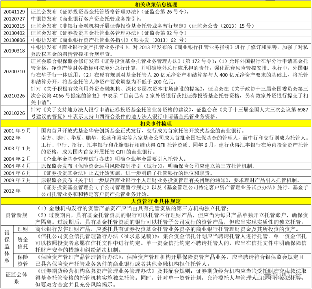 2、2004年11月,證監會發布《證券投資基金托管資格管理辦法》(證監會第26號令),為機構申請基金托管牌照提供了制度遵循。2008年基金托管牌照進一步由全國性銀行放開至城商行。