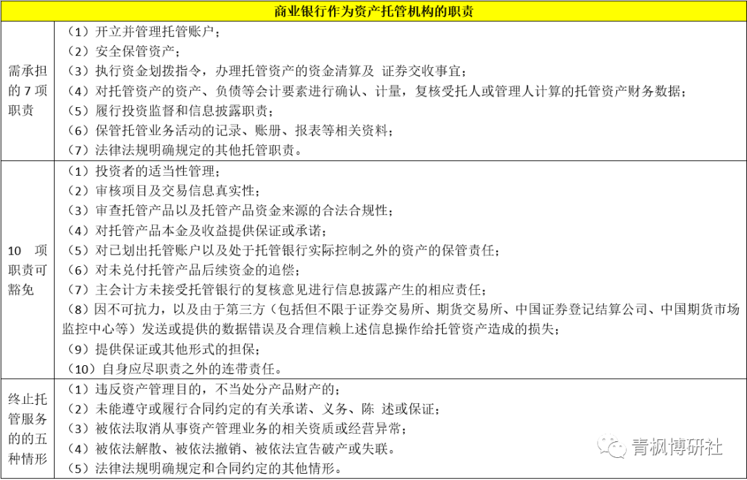 《商業銀行資產托管業務指引》明確商業銀行的托管職能主要包括資產保管服務、賬戶服務、會計核算(估值)服務、資金清算服務、交易結算服務、投資監督服務、信息披露服務以及其它。