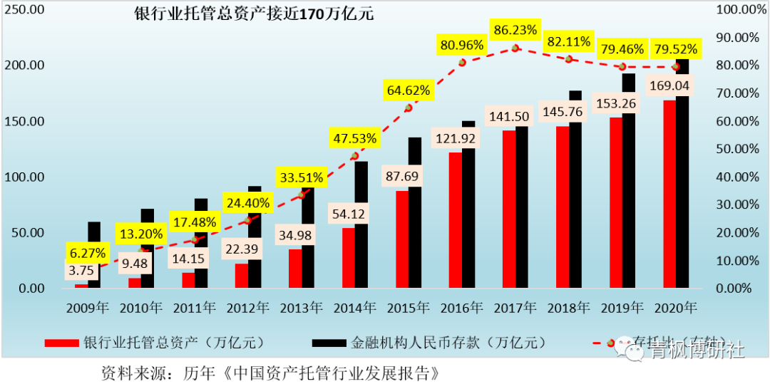 2、與之相對比,較高的托管規模增長步伐也有效提升了存托比,其從2009年的不到10%提升至2017年的86.23%。隨后在強監管的背景下,資管產品出現一定程度的萎縮,托管規模的增長步伐有所放緩,使得存托比亦相應下降至2018年的82.11%和2019年的79.46%,2020年則微幅抬升至79.52%。
