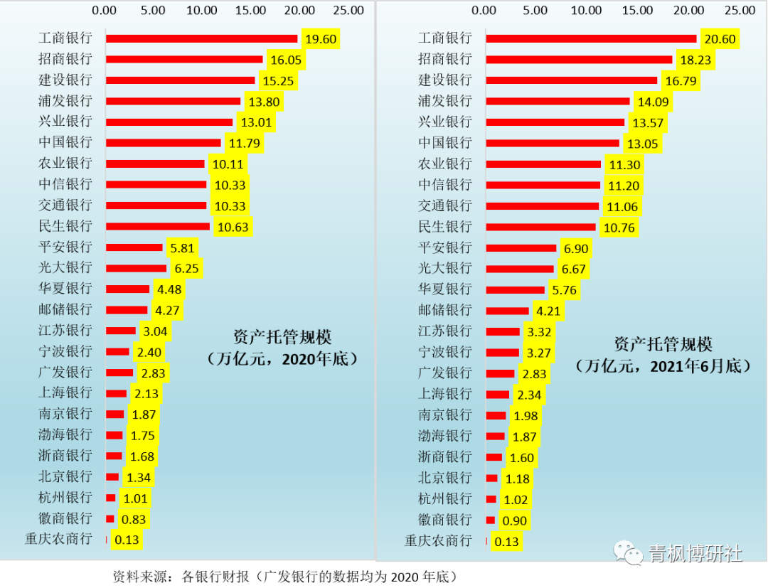 1、25家銀行在2020年底與2021年6月底的資產托管規模合計分別為170.72萬億和184.63萬億元,進一步印證目前銀行業托管資產規模應在185萬億左右。