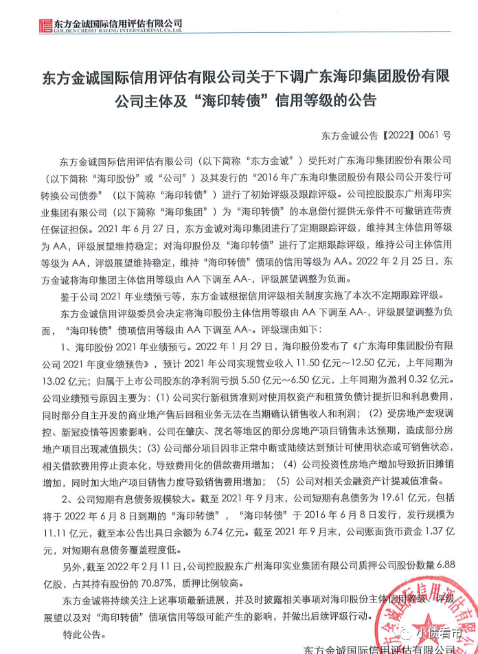 2月25日,東方金誠公告稱,決定將海印股份(000861.SZ)主體信用等級由“AA”下調至“AA-”,評級展望由“穩(wěn)定”調整為“負面”,“海印轉債”債項信用等級由“AA”下調至“AA-”。