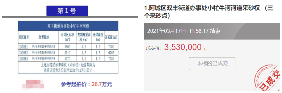 本標(biāo)的是位于哈爾濱市阿城區(qū)雙豐街道辦事處小牤牛的河河道采砂權(quán),其起拍價(jià)格為267,000元,歷經(jīng)2小時(shí)的激烈競(jìng)價(jià)之后以3,530,000元的價(jià)格成交,實(shí)現(xiàn)了3,263,000元的溢價(jià),溢價(jià)率高達(dá)1200%。這般激烈競(jìng)價(jià),真是讓人大開眼界!