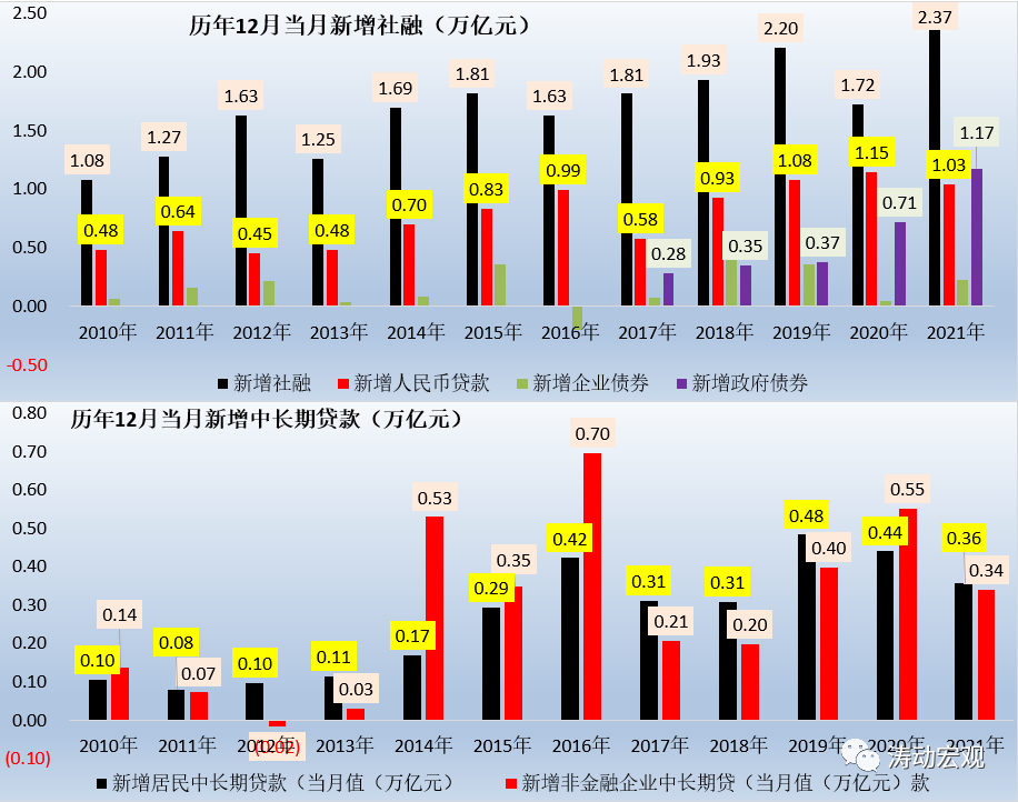 (一)2021年12月當月,新增社融達2.37萬億元,同比多增0.65萬億,主要由企業債券(同比多增0.18萬億元)和政府債券(同比多增0.46萬億元)貢獻。債券同比多增的因素主要有兩個,政府債券是因為地方政府在10-11月放量發行,企業債券則是由于去年11月受河南永煤事件影響導致同期基數較低。