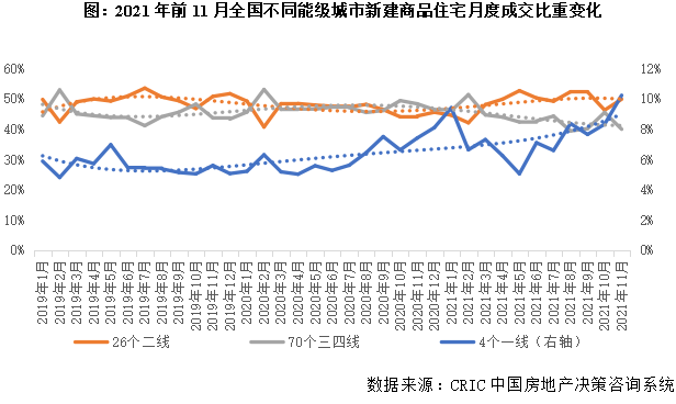 分能級來看,不同能級城市行情相對獨(dú)立,城市間分化也愈演愈烈:一線城市韌性較強(qiáng),收入渠道的多樣使得居民購買力相對充裕,成交占比波動(dòng)上行;二線城市則呈現(xiàn)出平穩(wěn)態(tài)勢,占比基本在50%左右波動(dòng),城市內(nèi)部分化加劇,漲多跌少,以廈門、杭州、南京、福州為典型的東南沿海城市,漲幅均在30%及以上;而諸如鄭州、昆明、南寧、西寧等中西部內(nèi)陸城市,下行顯著;而廣大三四線城市回調(diào)加劇,跌多漲少,尤其是步入2021年下半年以來,市場一再探底,11月當(dāng)月成交占比僅為40%,部分河南、山西、山東等中部三四線已然出現(xiàn)了首付分期、降價(jià)折扣等營銷手段齊上依舊難以拉動(dòng)成交的情況,居民購買力透支已是不爭的事實(shí),未來市場的成交表現(xiàn)難言樂觀。