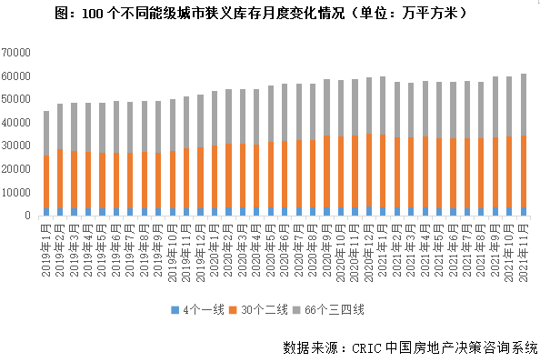 2021年因成交“先升后降”的行情,整體去化周期走勢也呈現(xiàn)出“先穩(wěn)后增”態(tài)勢:1-7月基本持穩(wěn)在10-12個(gè)月,8月隨著成交轉(zhuǎn)淡,去化周期開始逐月跳增,至11月末已達(dá)16.96個(gè)月。分能級來看,一線韌性較強(qiáng),去化周期由去年年末的9.51個(gè)月上漲至12.23個(gè)月,顯著低于百城平均。二三線穩(wěn)中有增,尤其是三四線城市,自5月開始去化周期步入陡增階段,由5月末的10.83個(gè)月波動(dòng)上行至11月末的19.2個(gè)月。