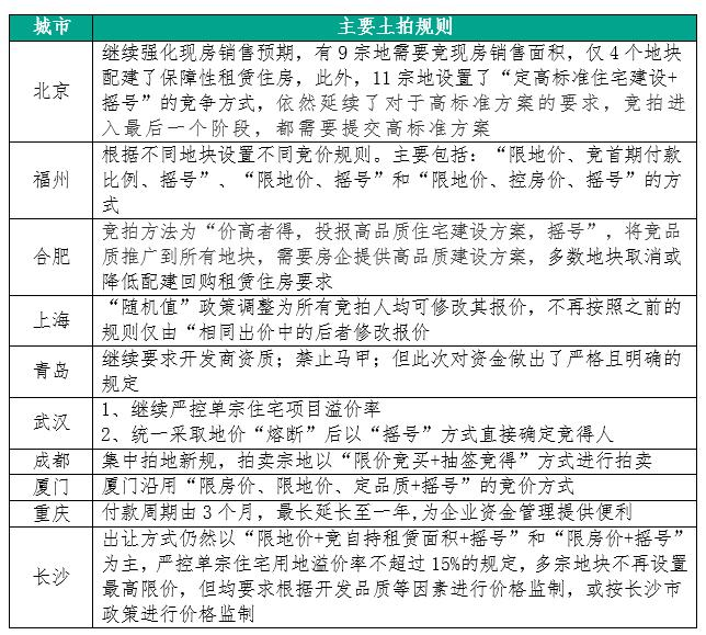 (1)集中出讓次數增加,供地量縮價漲,優質地塊放量;(2)土拍規則優化,“化繁為簡”,降門檻、提利潤,搖號/抽簽基本成標配,提升企業拿地意愿;(3)市場熱度分化明顯,合肥、廈門土拍熱度升溫,而部分庫存較大或市場處于調整期的城市土拍熱度仍保持低位;(4)拿地企業仍以國央企為主,部分城市穩健型、深耕型民企拿地積極性仍在。