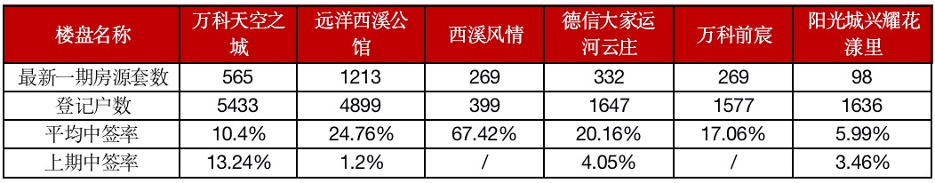 萬科天空之城、德信大家運河云莊、萬科前宸、遠洋西溪公館等6個紅盤項目加推,中簽率迅速走高。具體來看,6個項目中只有萬科天空之城、陽光城興耀花漾里兩個項目中簽率較低,但仍維持在10%左右,其余4個項目中簽率均在20%以上,最高的達到了67.42%。從登記戶數來看,基本在5000戶以下。