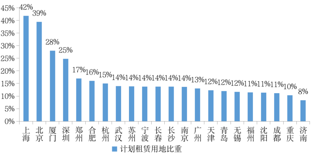 重點22城2021年供地計劃中,經過對商品住宅和租賃用地規模梳理和測算發現,除了濟南以外,其余21個城市租賃房供地計劃占比均高于10%,尤其是北京和上海兩個一線城市,租賃宅地占商品住宅用地的比重均在四成左右。