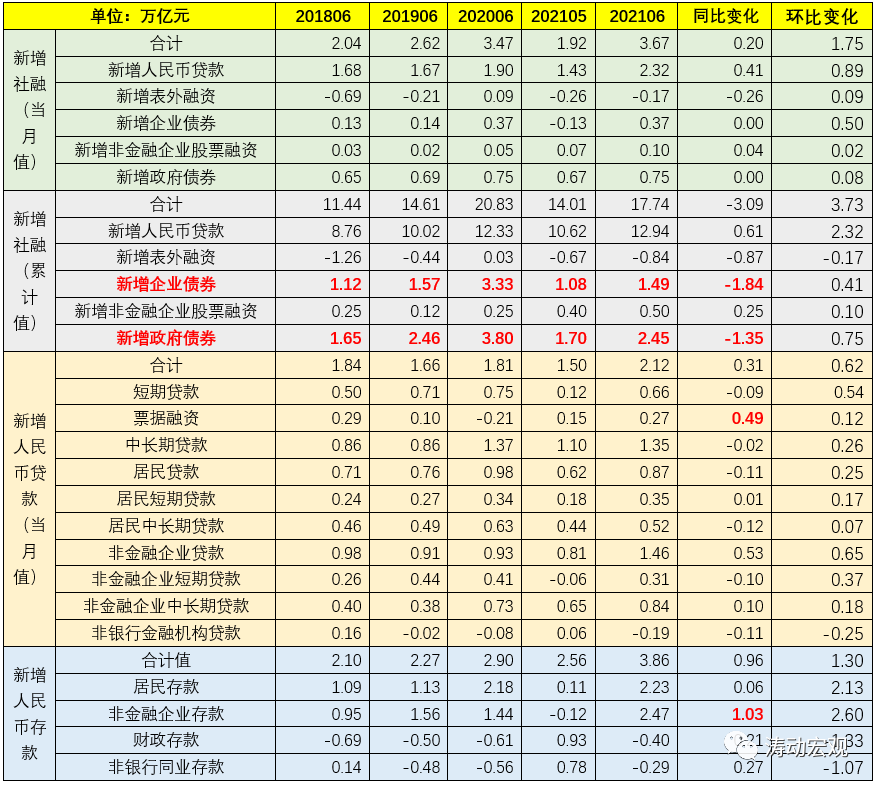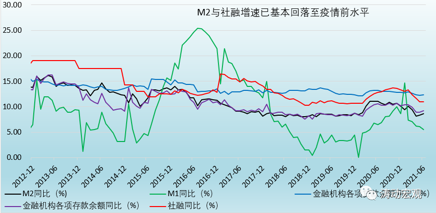 近年來的政策均明確“保持M2、社融增速與名義經濟增速基本一致”,并以此為基礎保持宏觀杠桿率水平基本穩定。雖然今年6月的M2與社融大超預期(票據融資和企業中長期貸款同比明顯多增、房貸少增、企業存款同比亦大幅多增),但增速基本上已回歸到疫情前的水平,較疫情期間下降明顯(今年前6個月企業債券和政府債券同比分別少增1.84萬億和1.35萬億、合計少增3.19萬億)。例如,2021年6月,M2、社融存量、貸款余額與存款余額同比增速分別降至8.60%、11%、12.30%和9.20%,已經和疫情前的平均水平相當。