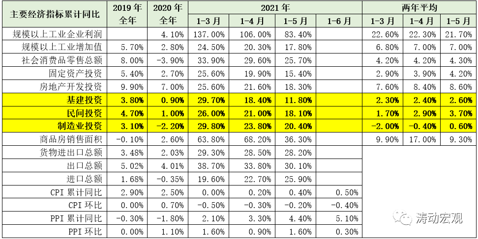 (二)從三駕馬車的表現來看,消費與投資等內需整體上仍處于低位緩慢修復態勢,房地產投資與貿易端延續了2020年的表現,對上半年的經濟修復貢獻力度較大,如1-5月的房地產投資累計同比、貨物進出口總額累計同比分別達到8.60%和28.20%。其中,房地產投資累計同比的兩年平均值高達8.60%,1-5月民間投資與制造業投資累計同比的兩年平均值則分別為3.70%和0.60%,較2019年的水平還有不少距離。