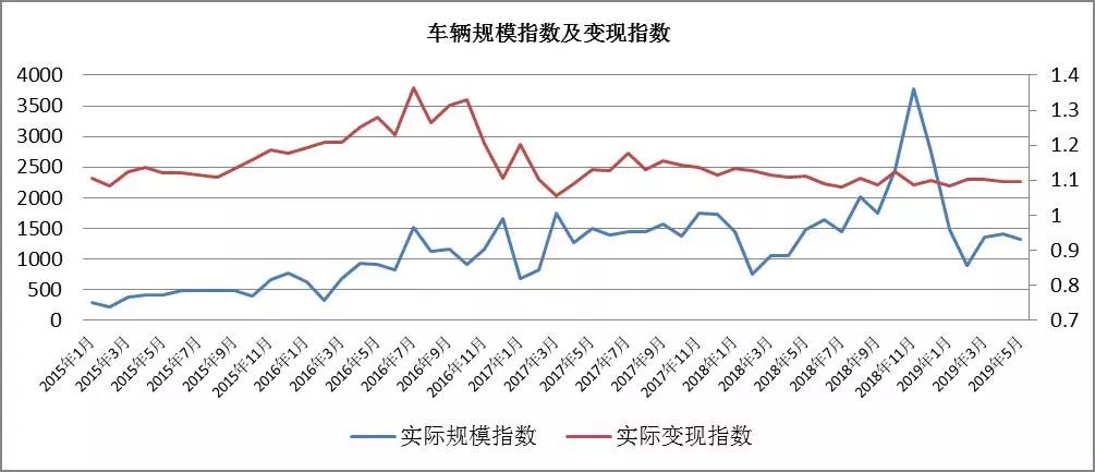 趨勢分析:車輛成交規模在2019年1月達到交易高峰,之后大幅下滑。機動車類資產變現能力非常強,絕大多數月份的平均變現折扣率都在110%以上,目前變現指數趨于穩定,存在溢價空間,在105%上下。