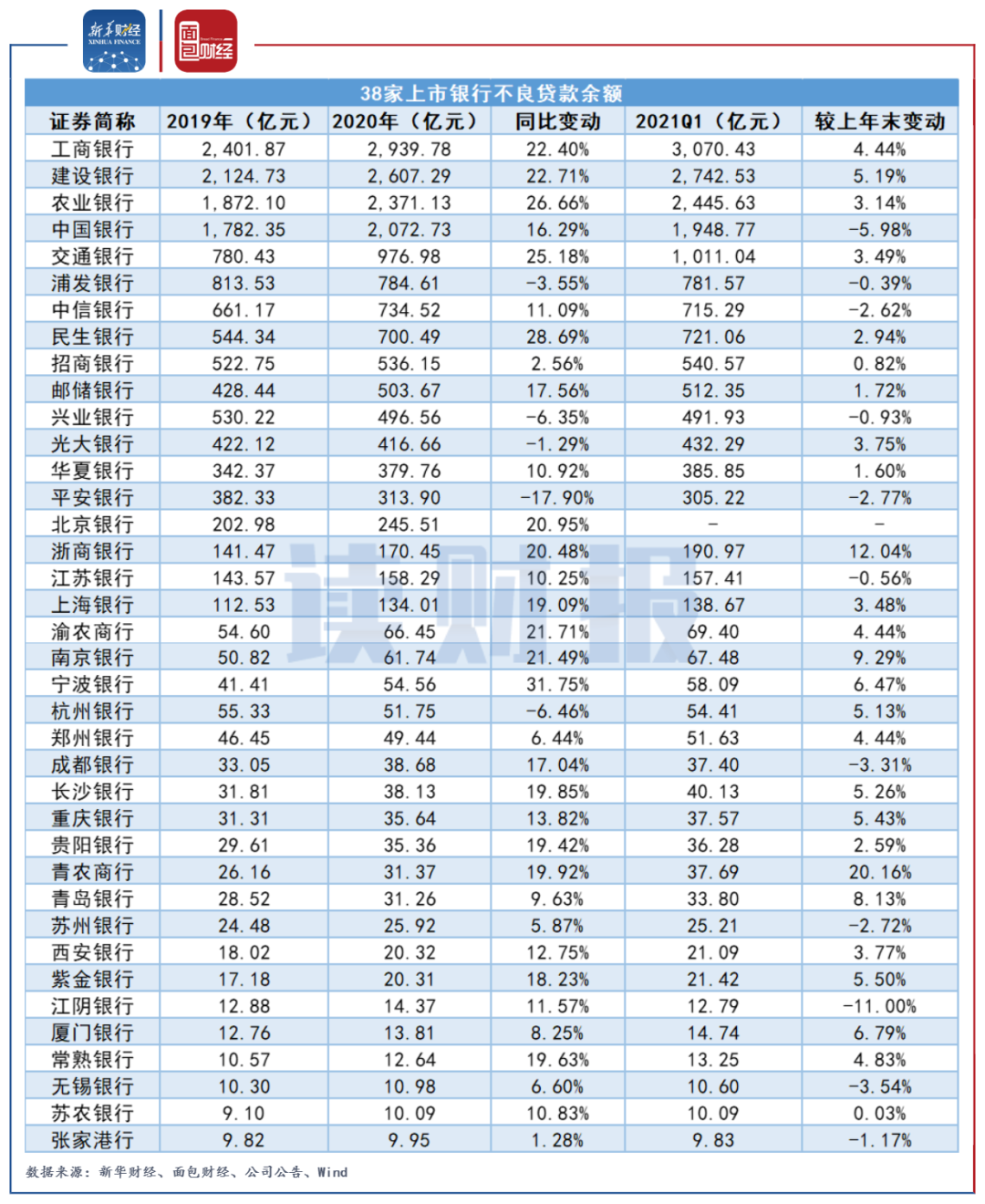 圖1:38家上市銀行2019-2021Q1不良貸款余額