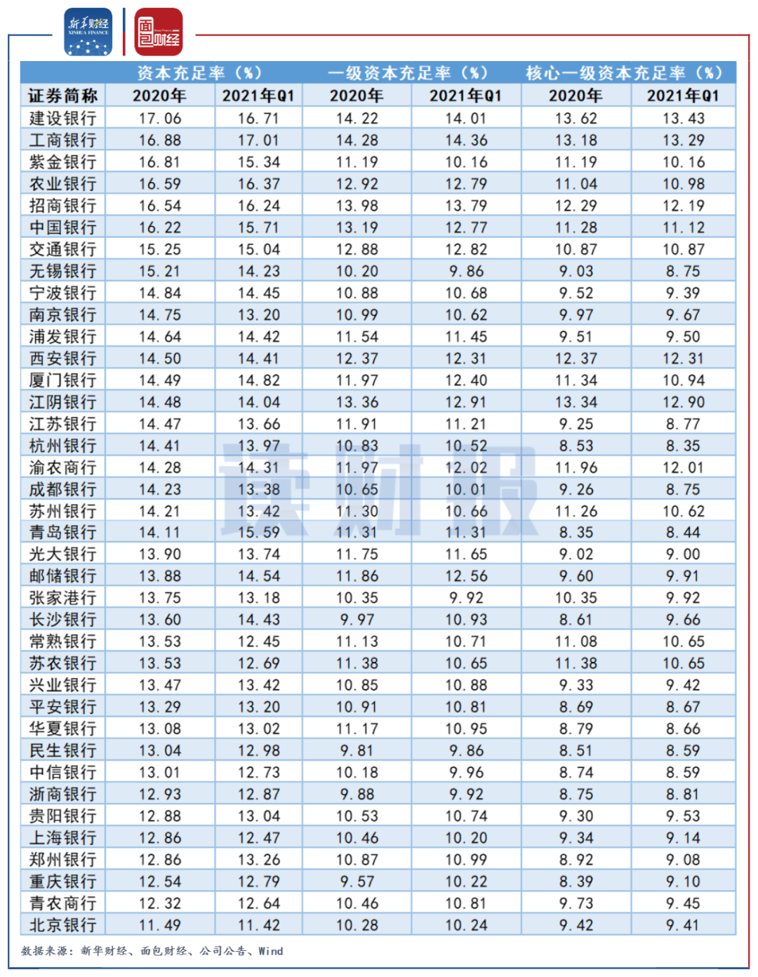 數據顯示,截至2020年末及2021年一季末,38家上市銀行各項資本充足率均滿足監管要求,但普遍出現下降,僅少數銀行出現增長。