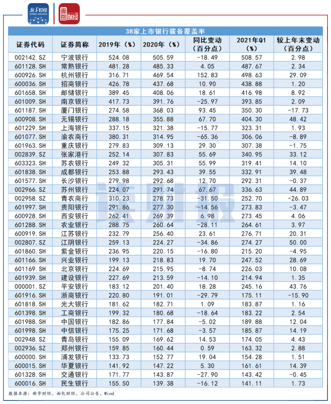數據顯示,截至2021年一季末,38家上市銀行的撥備覆蓋率均滿足監管要求,且多數銀行較上年末出現增長。