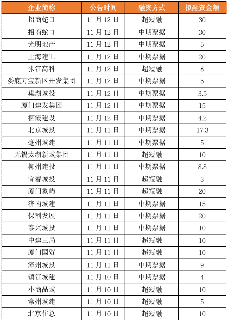 值得注意的是,11月11日,保利發(fā)展擬發(fā)行20億元中期票據(jù),將銀行間債券市場的融資主體從城投擴展到主流房企,隨后,光明地產(chǎn)和招商蛇口等紛紛公告擬發(fā)行中期票據(jù)和超短融,企業(yè)融資“冰凍”狀態(tài)有所緩解。