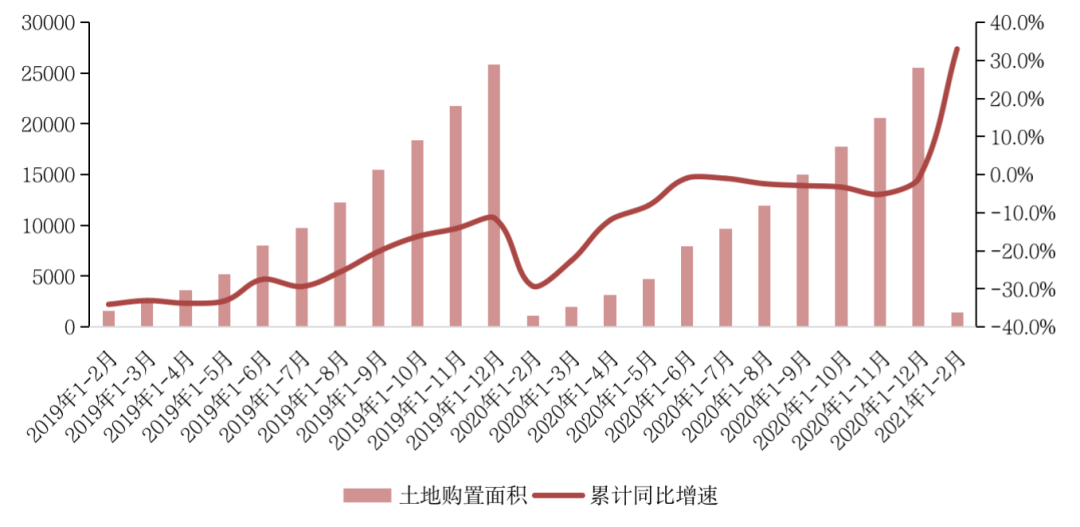 隨著疫情影響削弱及到位資金的增長,房企的拿地積極性有所回升。國家統計局數據顯示,1-2月份,房地產開發企業土地購置面積1453萬平方米,同比增長33.0%,但較2019年仍降6.0%。此外,前2月土地成交價款503億元,增長14.3%。