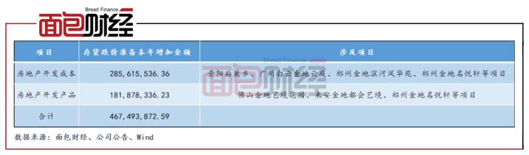據(jù)披露,公司持有在建開發(fā)成本貴陽后巢鄉(xiāng)、廣州白云金地云庭、鄭州金地濱河風(fēng)華苑、鄭州金地名悅軒等項(xiàng)目,因可變現(xiàn)凈值低于開發(fā)成本賬面金額,于當(dāng)年末計(jì)提跌價(jià)準(zhǔn)備約2.9億元;持有開發(fā)產(chǎn)品佛山金地藝境花園、來安金地都會(huì)藝境、鄭州金地名悅軒等項(xiàng)目,因可變現(xiàn)凈值低于開發(fā)成本賬面金額,于當(dāng)年末計(jì)提跌價(jià)準(zhǔn)備約1.8億元。