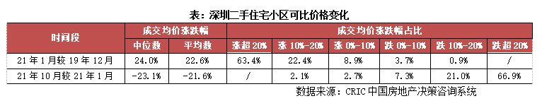 3、深圳二手房可比價格由95%小區上漲轉為95%小區下跌,可比價格中位數下跌23%。