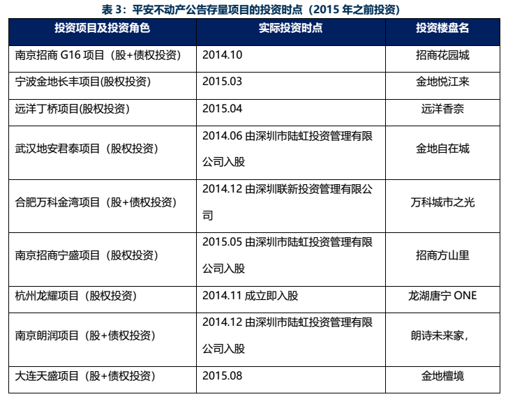 根據(jù)公司的20年中報(bào),多數(shù)股權(quán)投資項(xiàng)目始于15年投資,近一步追溯相關(guān)公開信息網(wǎng)站,則可以發(fā)現(xiàn)平安不動(dòng)產(chǎn)許多存續(xù)項(xiàng)目其實(shí)已在14年入股,并于15年中更換投資主體。
