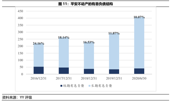 由于平安不動(dòng)產(chǎn)的管理規(guī)模擴(kuò)增是基于平安集團(tuán)的LP資金(體現(xiàn)于長(zhǎng)期股權(quán)投資方面的表外)注入,而表內(nèi)的結(jié)構(gòu)穩(wěn)定則是基于主動(dòng)投資收益尚能覆蓋財(cái)務(wù)費(fèi)用,疊加被動(dòng)收入和股東背景支持。因此圖11可見,隨著有息負(fù)債杠桿的增加,平安不動(dòng)產(chǎn)仍能維持相當(dāng)?shù)捅壤亩唐谟邢鶆?wù)。