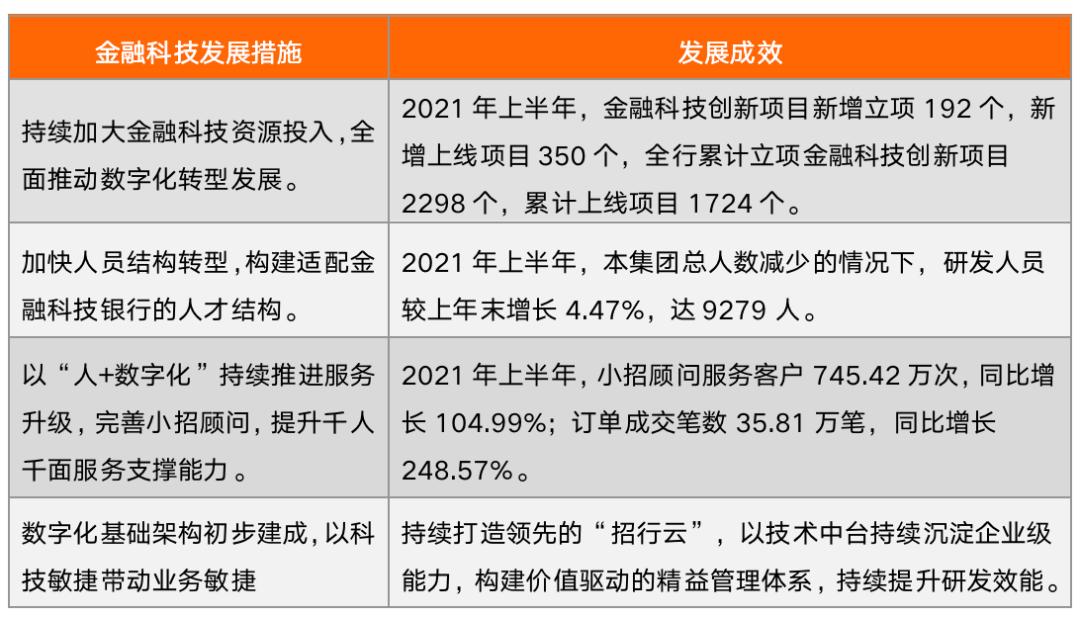 招商銀行在資源投入、人才結構、服務能力和科技水平等四個方面,推動金融科技發展,取得了顯著成效。2021年上半年,招行信息科技投入50.55億元,與上兩年同期相比有所增加,同期該行金融科技創新項目新增立項192個,新增上線項目350個,研發人員較上年末增長4.47%,達9279人。