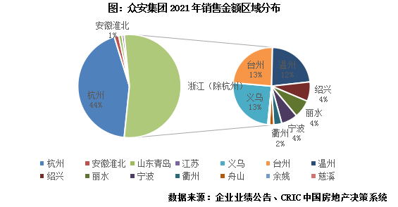 97%銷售額來自于浙江省內,大本營杭州貢獻全部銷售額的44%。根據企業披露的銷售明細,眾安集團堅持立足浙江省,深耕長三角戰略。大本營杭州一城銷售貢獻占比達44%,臺州、義烏以及溫州三城也分別貢獻了13%、13%及12%的銷售。結合企業投資戰略和2021年拿地情況來看,未來企業銷售仍將以浙江省內為主,紹興貢獻率有望隨著新項目的入市增長。