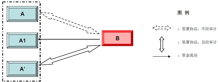 其中B為收購(gòu)方,A為轉(zhuǎn)讓方,A1受A的實(shí)際控制但沒(méi)有直接的股權(quán)關(guān)系,A’為A的合作伙伴