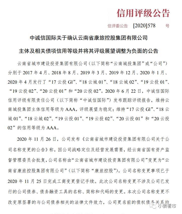 近日,中誠信國際公告稱,確認云南省康旅控股集團有限公司(以下簡稱“康旅控股”)主體和相關債項信用等級為AAA,評級展望調整為負面。