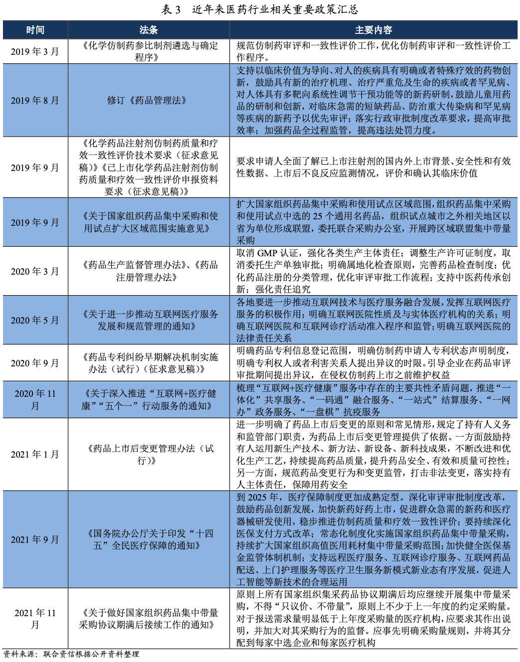 2019年以來,集中帶量采購、醫??刭M等政策的持續推進為醫藥行業帶來了深刻變革;與此同時,藥品審評審批、專利糾紛早期解決等政策的不斷完善也為醫藥行業帶來了新的機遇。2020年新冠疫情催生“互聯網+醫療”的蓬勃發展,相關規范化政策的陸續出臺為“互聯網+醫療”的可持續發展保駕護航。2021年“十四五”規劃發布,進一步明確醫藥行業發展方向,各項政策持續推進。