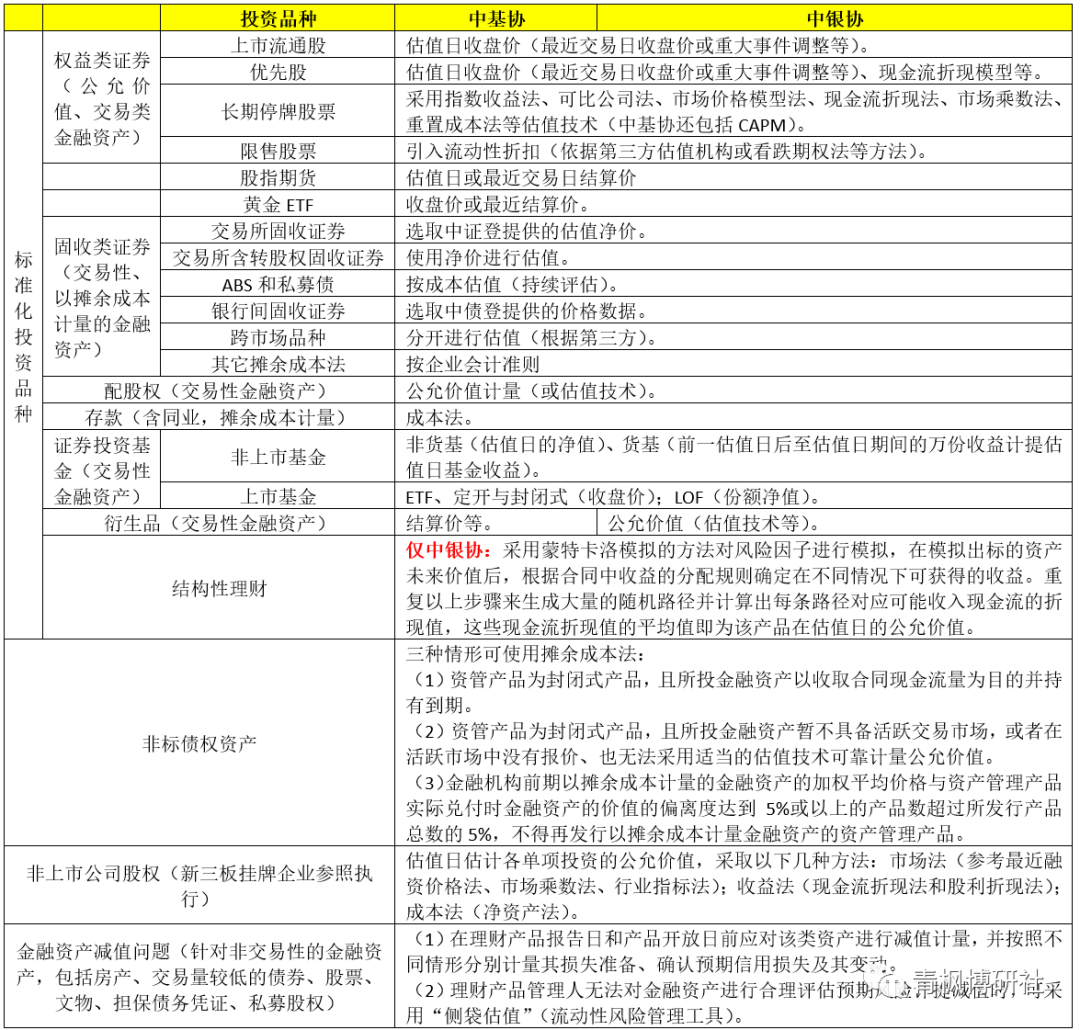 (四)中基協(xié)與中銀協(xié)關于資管投資品種估值標準的對比