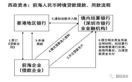 前??缇橙嗣駧刨J款系指在前海注冊成立并在前海實際經營或投資的企業從香港經營人民幣業務的銀行借入人民幣資金的業務。資金用途上不得用于投資有價證券和金融衍生品,不得用于委托貸款,不得用于購買理財產品,不得用于購買非自用房產等。其基本流程如下: