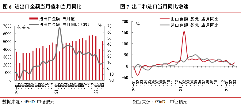 4月13日,海關總署公布3月和一季度外貿數據:按美元計,出口同比增速為14.7%,較1-2月16.3%的同比增速有所回落;進口同比出現負增長,增速由1-2月的15.5%降至3月的-0.1%;貿易順差為473.8億美元,明顯低于2021年下半年平均水平??偟膩砜矗?月中國出口韌性繼續顯現,但受疫情影響,防控政策收緊、國際大宗商品價格高漲等因素開始成為進口回落的壓力來源,進口表現明顯不及預期。