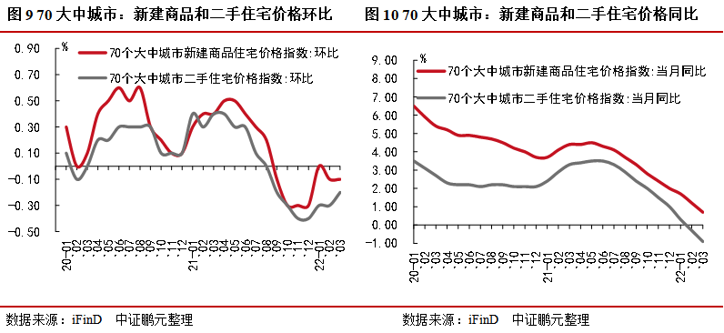 3月份,70個大中城市新建商品住宅和二手住宅銷售價格環比分別上漲-0.1%和-0.2%,前值為-0.1%和-0.3%,環比繼續下降。同比分別上漲0.7%、-0.9%,前值為1.2%、-0.3%,同比漲幅繼續回落。