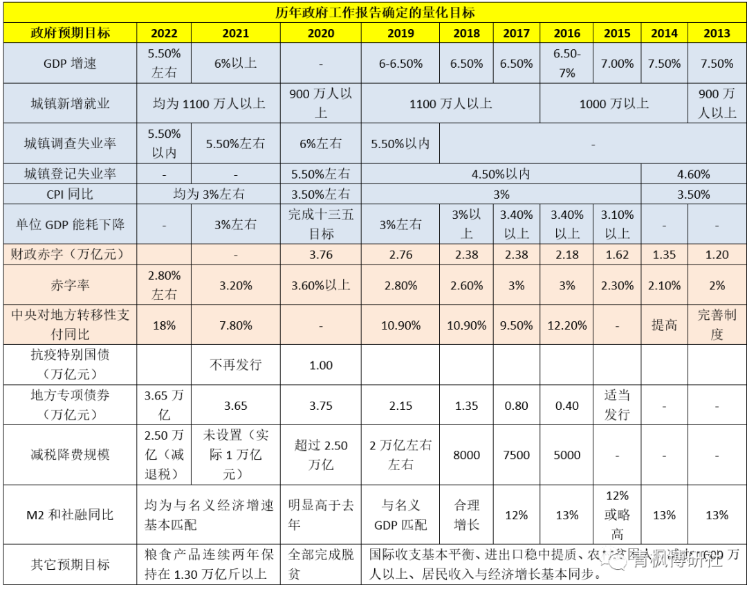 (一)2013年以來歷年政府工作報告量化目標對比表