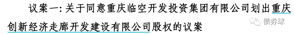 上述3只產(chǎn)品涉及的議案均為兩個,分別涉及:資產(chǎn)劃出和資產(chǎn)劃入,具體見下圖。本文討論的主要是議案一,關(guān)于發(fā)行人計劃將下屬子公司重慶創(chuàng)新經(jīng)濟走廊開發(fā)建設有限公司100%股權(quán)劃出。