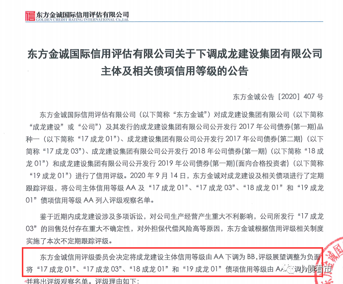 近日,東方金誠公告稱,將成龍建設(shè)集團(tuán)有限公司(以下簡稱“成龍集團(tuán)”)主體信用等級由AA下調(diào)為BB,評級展望調(diào)整為負(fù)面;將“17成龍01”、“17成龍03”、“18成龍01”和“19成龍01”債項信用等級由AA下調(diào)為BB并移出評級觀察名單。