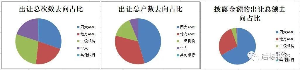從出讓去向上看,四大AMC和地方AMC的總次數和總戶數相近,但總金額上,四大AMC占了將近70%,這是因為四大跟國有六大行的業務聯系更密切,而自然人和二級機構雖然也從銀行直接受讓債權,但因監管原因通常以單戶債權為主,故總金額占比較小。銀行出讓至四大AMC的債權總額為2646億,出讓至地方AMC的債權總額為1098億元,由此推測出目前四大AMC和地方AMC在銀行債權出讓一級市場的受讓比例大約為7:3。
