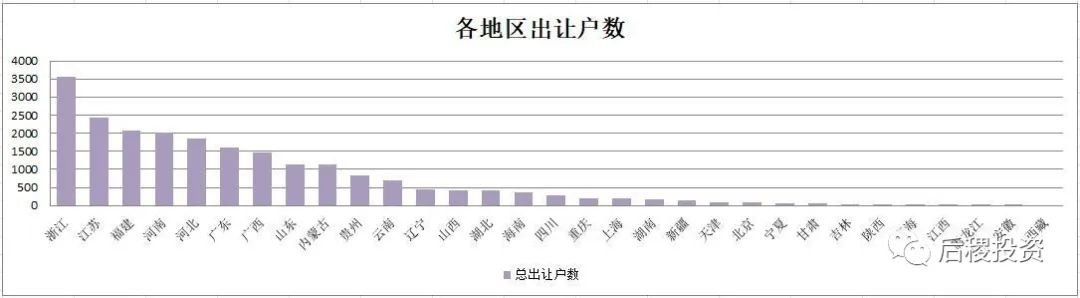 從上圖看,銀行出讓成交次數前五的省份是山東、浙江、廣東、江蘇和河北;戶數前五的省份是浙江、江蘇、福建、河南和河北,廣東排第六;而出讓總額排名前五的省份是浙江、河南、廣東、山東和江蘇,福建、遼寧、河北、山西緊隨其后,較其他地區為高。仍舊可以看出東部地區省份,銀行的出讓力度較其他地區為高,當然這也與我國的經濟總量分布有關。