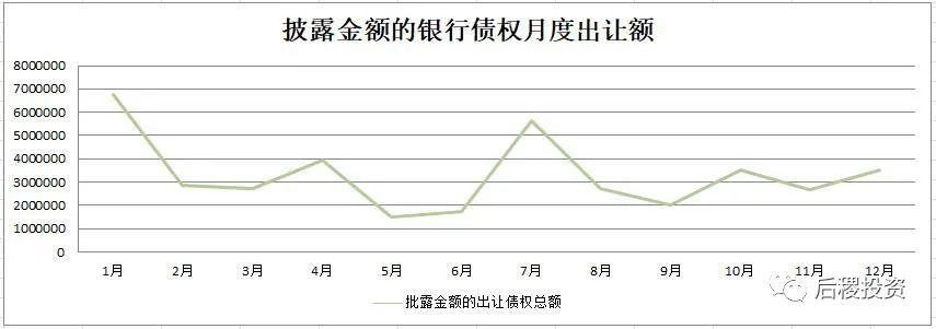除1月外,銀行月度出讓次數曲線的區間為94-206次,區間中值為150次左右,戶數區間為827-2776戶,區間中值為1800戶左右,而月度出讓成交金額的區間中值則為350億元左右。1月和7月是公告成交的高峰期,這與業務規律也契合。