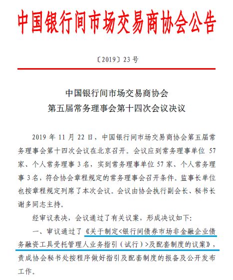 2019年11月22日,交易商協會第五屆常務理事會第十四次會議在北京召開。會議審議通過了《關于制定〈銀行間債券市場非金融企業債務融資工具受托管理人業務指引(試行)〉及配套文件的議案》、《關于修訂〈銀行間債券市場非金融企業債務融資工具持有人會議規程〉的議案》……