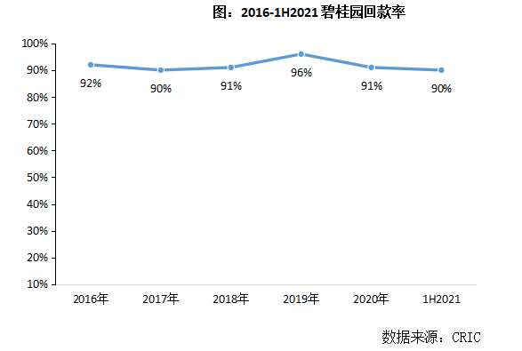 企業層面,樣本企業中35家房企的經營性現金流凈額同比發生了增長且為凈流入狀態,其中同比增長最多的是碧桂園,同比增加265億元。碧桂園自2019年開始就以回款為行政考核標準,回款率已經連續6年保持在90%及以上。2021年上半年,碧桂園權益物業銷售現金回款2727.9億元,權益回款率為90%。該考核制度下,對于形成企業內部回款秩序、提升效率都起到良好的促進作用,得以保證現金流風險可控、經營穩定。