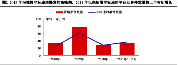 2018年,《關于規范金融企業對地方政府和國有企業投融資行為有關問題的通知》(財金[2018]23號)、《關于規范金融機構資產管理業務的指導意見》(銀發[2018]106號)等文件出臺,杜絕了以政府“承諾”的形式增信,且對金融機構投資非標產品提出了限額、流動性管理等方面要求。上述舉措對于城投公司非標融資影響較大,從供需端對非標產品進行了雙重壓縮,在原有非標產品到期后,新非標產品續接難度加大,若未能找到有效的融資替代渠道,極可能導致平臺資金鏈斷裂,出現非標違約情況,2018-2019年也為我國城投非標違約事件發生的高峰期。
