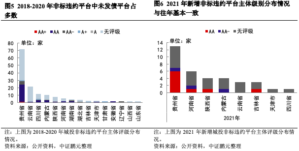 從非標違約平臺的主體級別來看,2021年新增的非標違約平臺仍以未評級為主,占比65.71%,其次為AA平臺,占比25.71%,級別分布趨勢與往年相似。2021年貴州省、甘肅省、內蒙古分別有5家、1家和1家城投平臺出現主體評級下調情況,這些平臺均為已發生非標違約事件的平臺。