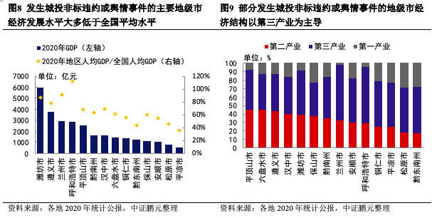 從經濟發展水平來看,除發生輿情事件的濰坊市外,其余發生非標違約或輿情事件的主要地級市2020年GDP全部在4,000億元以下,且同期地區人均GDP基本低于全國人均GDP,地區經濟發展水平較低。從產業結構來看,發生城投非標違約或輿情事件的地級市基本以第二、三產業為主導,所從事產業基本為煤炭、煙、酒等傳統產業,部分地區工業基礎薄弱或轉型壓力大,工業對經濟貢獻不高,產業結構以第三產業為主導,典型地區包括平涼市、松原市、黔東南州、蘭州市、呼和浩特市等地。例如,蘭州市地處內陸,工業以石油、化工等傳統產業為主,產業轉型壓力大,第三產業以房地產、金融、批發零售、文旅產業為主,2020年第三產業在三次產業結構中占比65.68%;呼和浩特市地處中國北部邊疆,依托當地資源稟賦,工業以乳業、電力、生物制藥、原油等傳統產業為主,工業經濟增長乏力,經濟以第三產業為主導,房地產、文旅產業發展較好。
