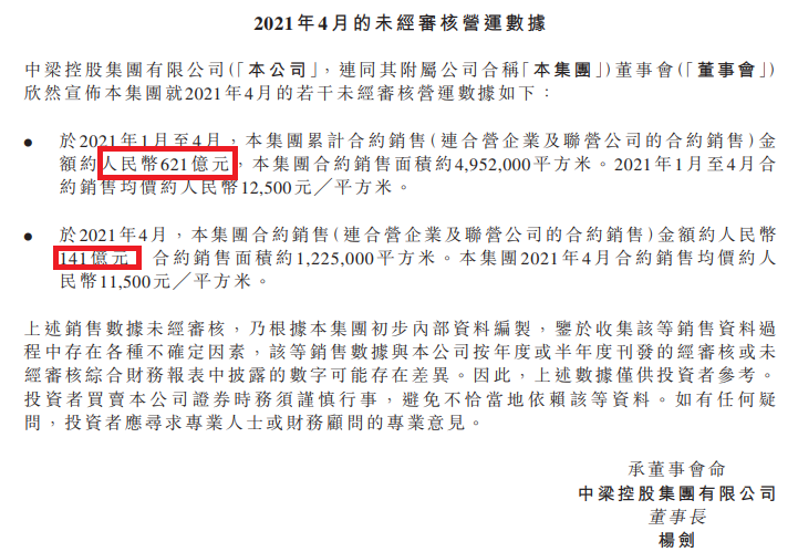 如下圖,2021年4月,中梁控股合約銷售額為141億元,當月單價約11500元/平米。