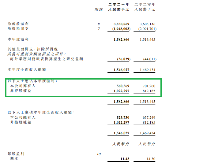 更蹊蹺的是,非控股權益部分的凈利高達10.22億元,2020年為8.12億元——這利潤的結(jié)構,實在是好玩。